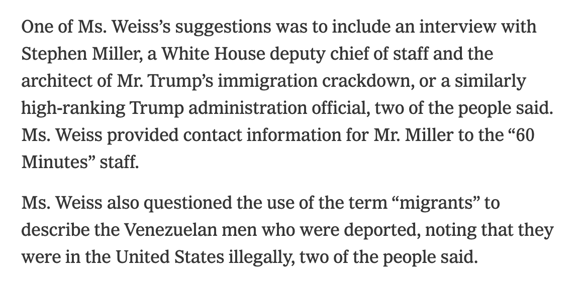 Two days before the show was to air, Weiss suggested revamping it, including adding interviews of Stephen Miller, whose personal contact information she has (of course). Also objected to calling migrants migrants.