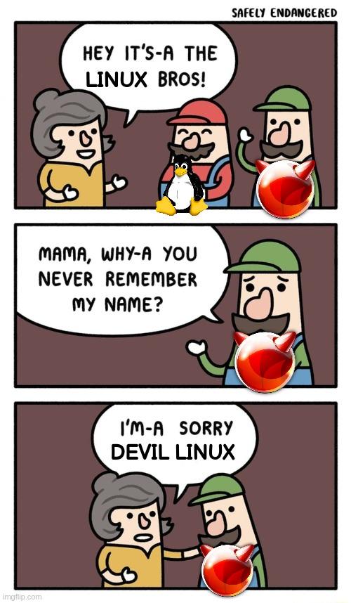 alt Mama greets Mario (labeled with Tux) and Luigi (labelled with the FreeBSD horned-ball), "Hey, it's-a the Linux bros!" Luigi/FreeBSD whines, "Mama, whya-a you never remember my name?" Mama responds, "I'm-a sorry, Devil Linux" Mama greets Mario (labeled with Tux) and Luigi (labelled with the FreeBSD horned-ball), "Hey, it's-a the Linux bros!" Luigi/FreeBSD whines, "Mama, whya-a you never remember my name?" Mama responds, "I'm-a sorry, Devil Linux"