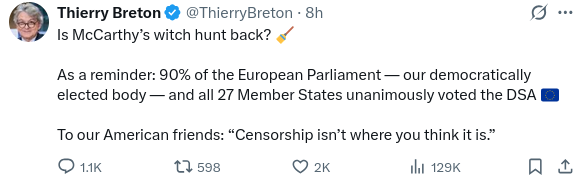 Tweet from Thierry Breton: Is McCarthy’s witch hunt back? 🧹 As a reminder: 90% of the European Parliament — our democratically elected body — and all 27 Member States unanimously voted the DSA 🇪🇺 To our American friends: “Censorship isn’t where you think it is.”