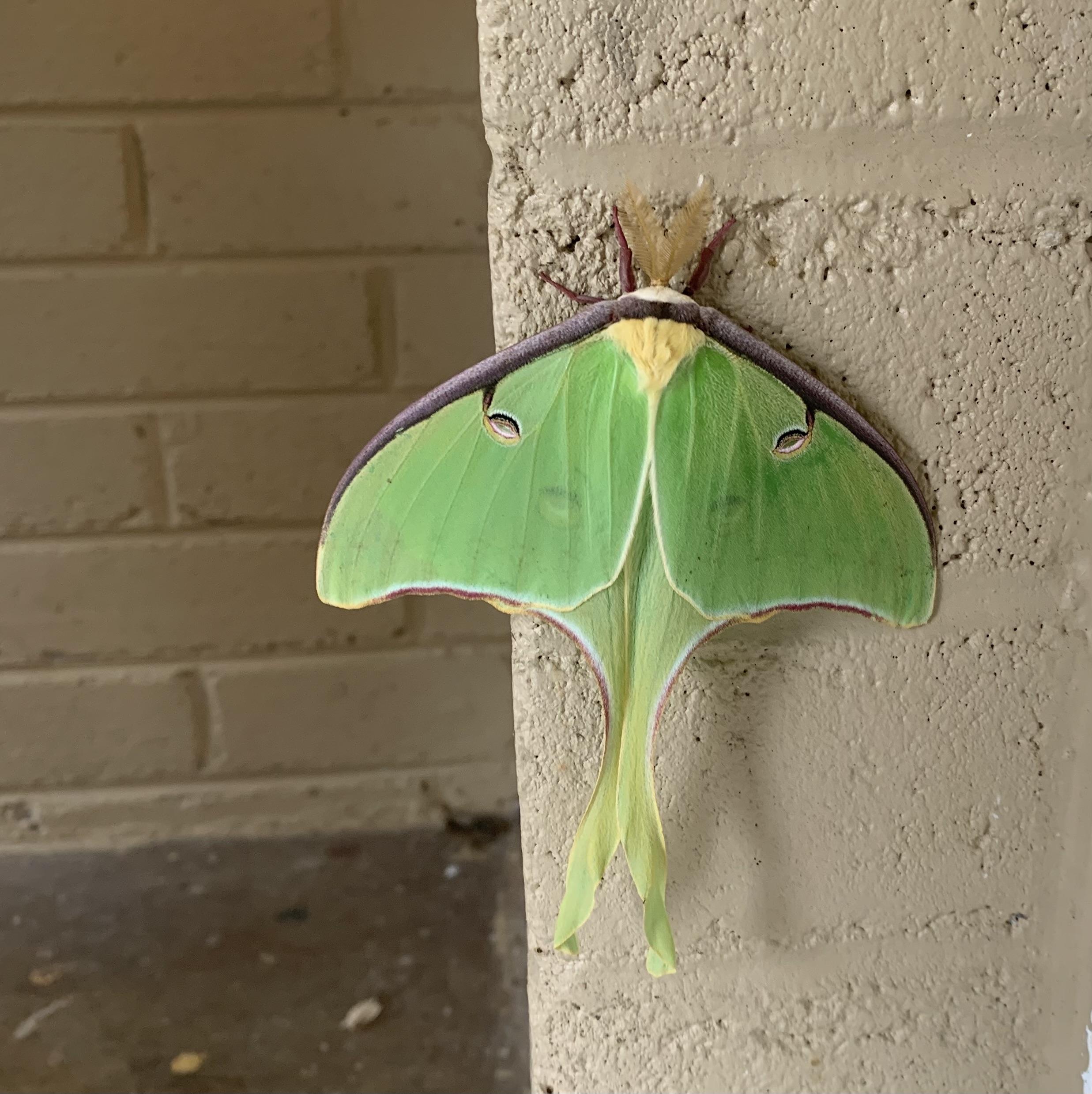 It’s a large green and yellow and white moth, with elaborate “tails“ extending downward. And also has very prominent “fuzzy“ antenna. It is perched on a brick wall, which gives an example of its size - about 6 inches long