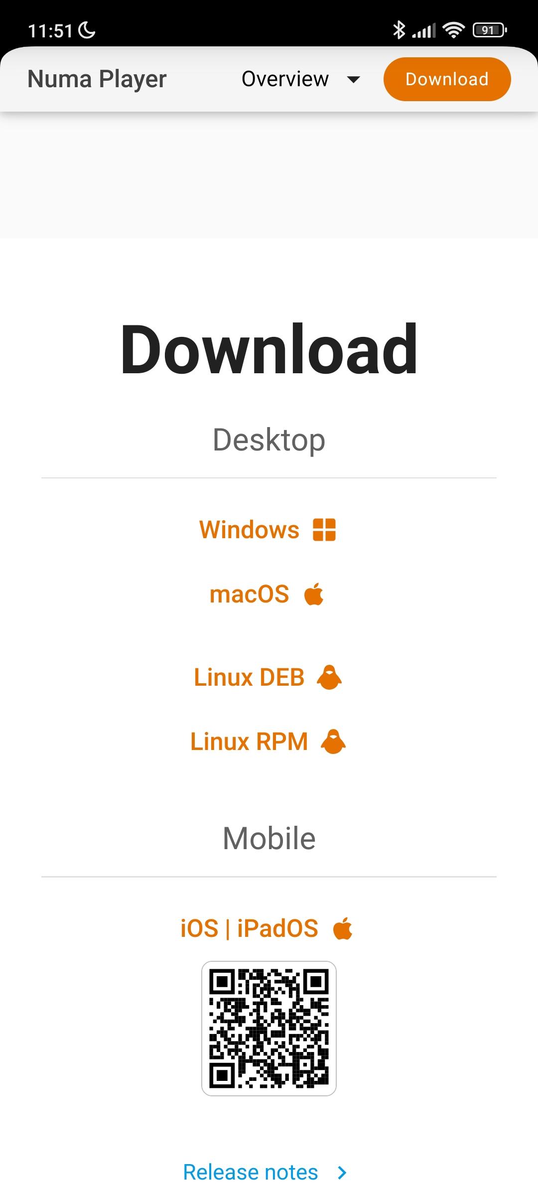 Screen shot of all the available downloads of Numa Player with windows, mac, Linux and ios