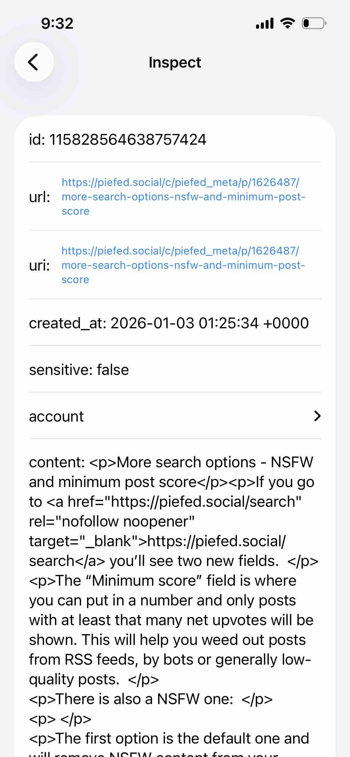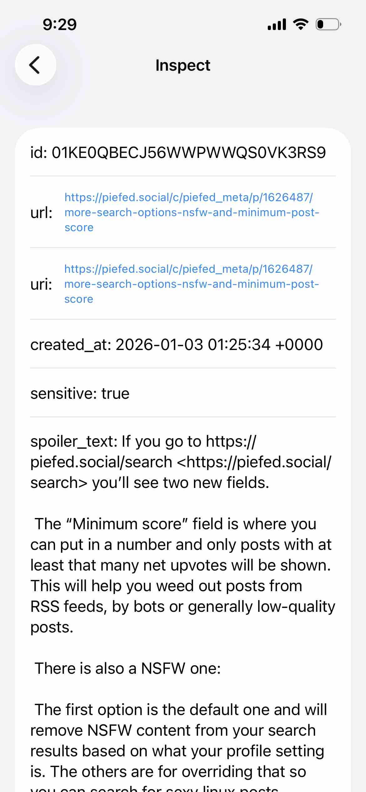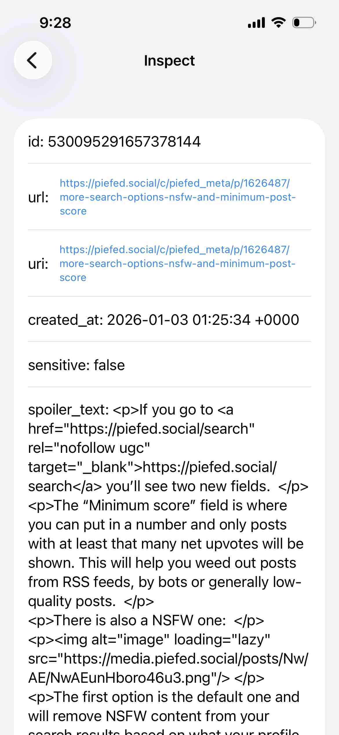 I've seen the raw HTML for some #piefed post content showing in the spoilerText field on some platforms via the mastodon api, including #gotosocial, #neodb (takahe/incarnator) and I think #pleroma. My current kludge is to check the spoilerText for html tags (specifically, a beginning <p>).
