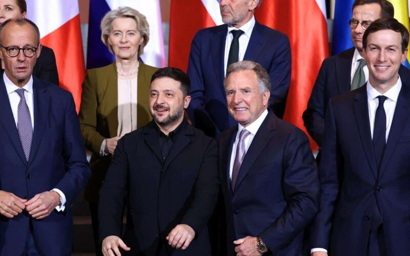L to R: German Chancellor Friedrich Merz, European Commission President Ursula von der Leyen, Ukraine President Volodymyr Zelensky, and Donald Trump’s envoys Steve Witkoff and Jared Kushner, Berlin, December 15, 2025