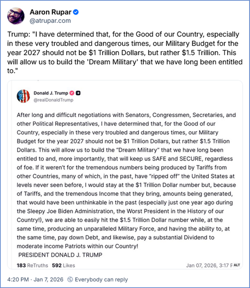 Funding for international adventures and quagmires is being lined up to come from tariffs (i.e., from U.S. consumers), a whopping extra 500 billion dollars per year to "build the 'Dream Military' that we have long been 'entitled to.'"