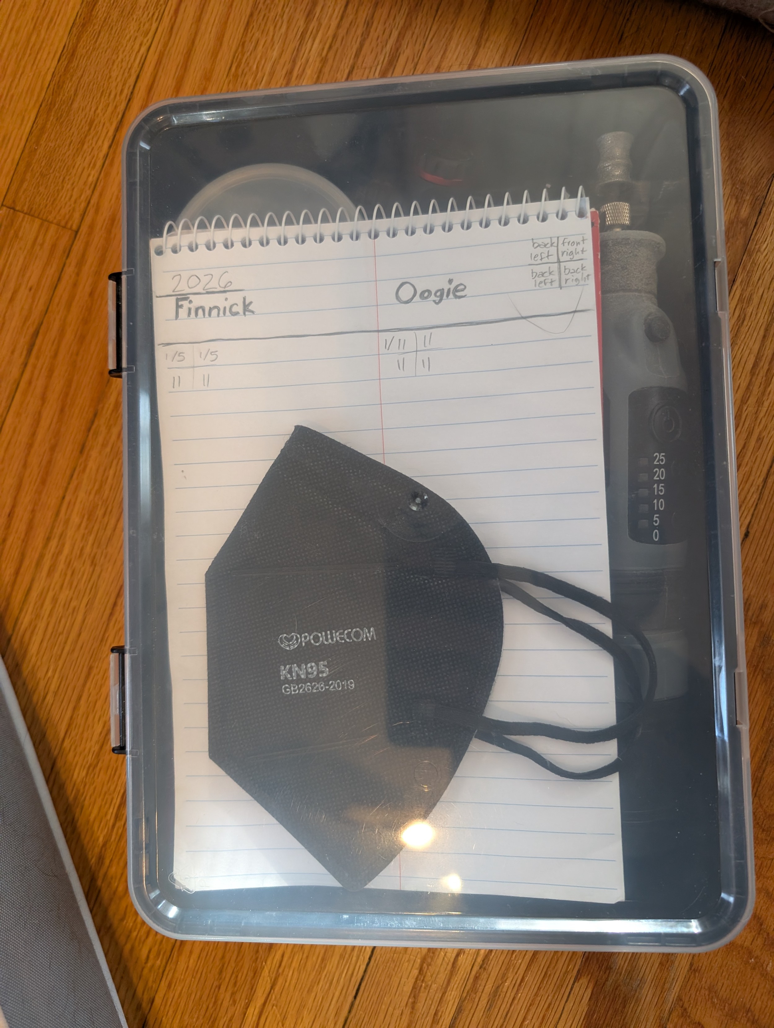 A clear box with a rotary tool, notepad, and a kn95 mask visible. Not visible are treats and a headlamp. The rotary tool has a dog nail bit and shows speeds for 25, 20, 15, 10, 5 (thousands of rpm). It starts at 15, and I use 15 or 10 for nails. The notepad says “2026” and is divided into “Finnick” and “Oogie.” I have marked on the paper which nails I have done which days.