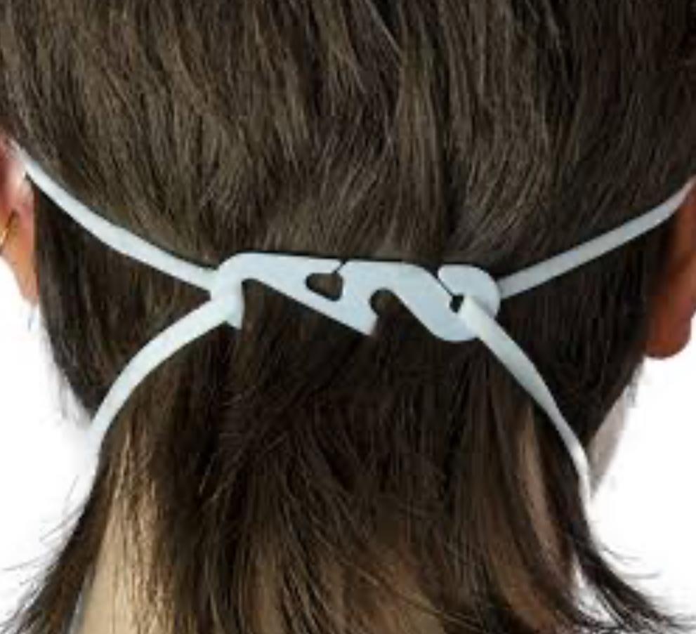 The image shows a close-up, back-view of a person's head, focusing on a mask strap extender (also known as an "ear saver").