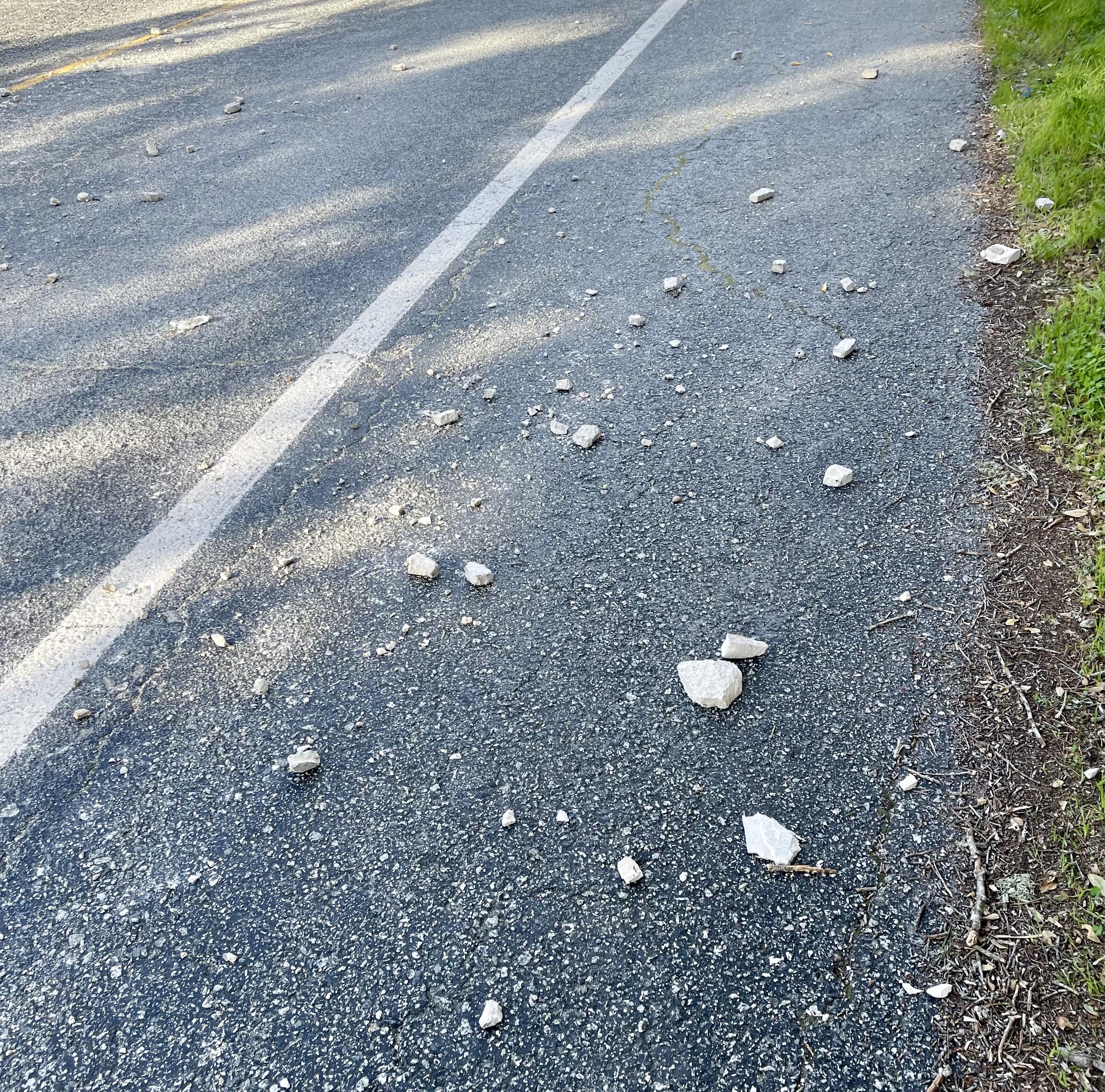 That鈥檚 what we started to do, attempting to use our feet to clear the west shoulder of Olmsted Rd near Hwy 68 / CA SR 68. Then we noticed the east shoulder and travel lanes were likewise strewn with many rocks! Don鈥檛 know what mishap left that mess, but we鈥檙e reporting to road cleanup crews : https://bikemonterey.org/where-to-report-a-bikeway-maintenance-need-in-monterey-county-plus-maintenance-needs-for-california-state-highways.html.