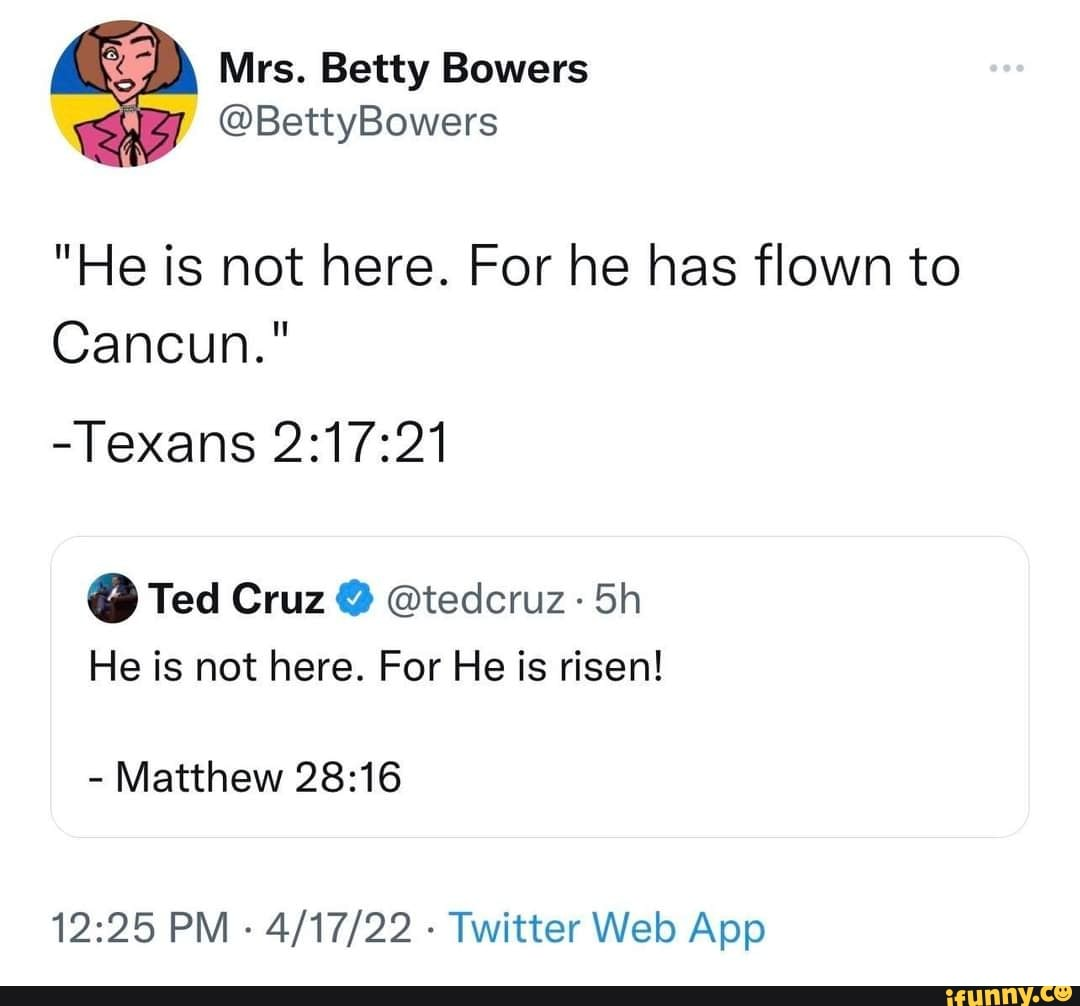 Twitter Post Mrs. Betty Bowers @BettyBowers "He is not here. For he has flown to Cancun." -Texans 2:17:21 12:25 PM - 4/17/22 - Twitter Web App -- in reply to -- Ted Cruz ® @tedcruz He is not here. For He is risen! - Matthew 28:16
