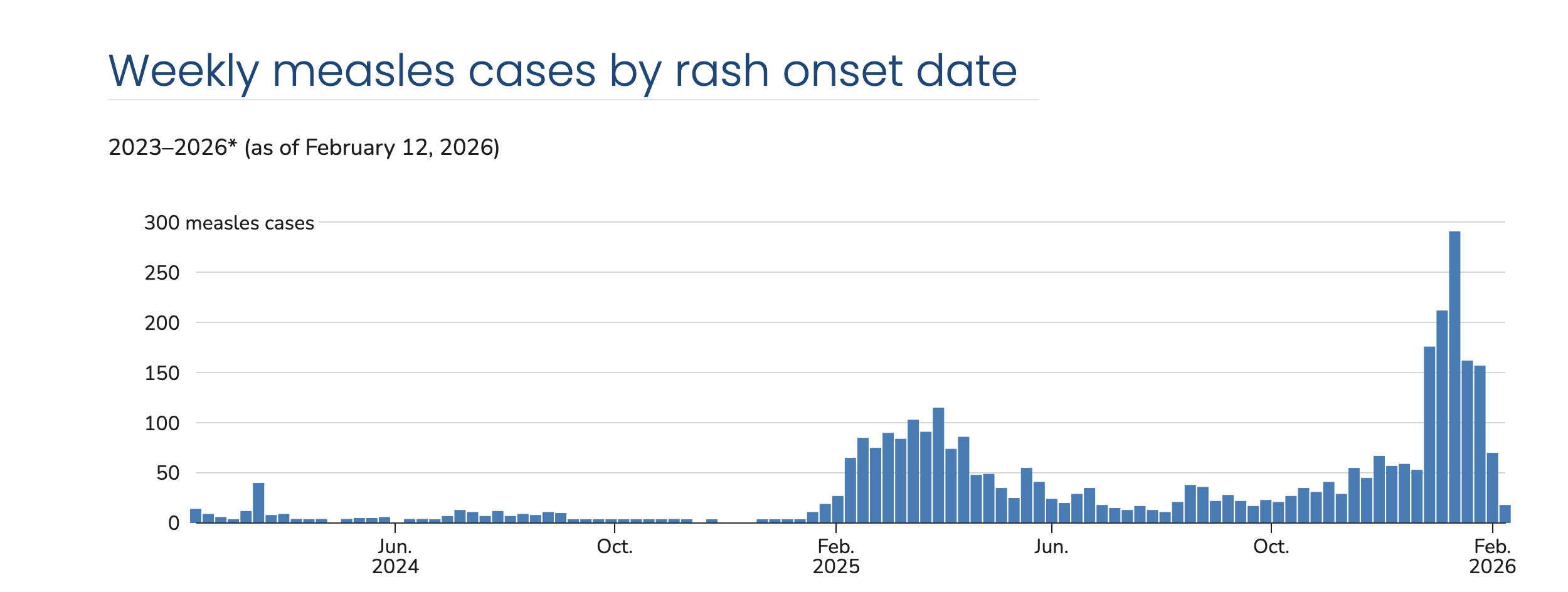 The weekly measles cases by rash onset date. There's a huge spike starting in December 2025.