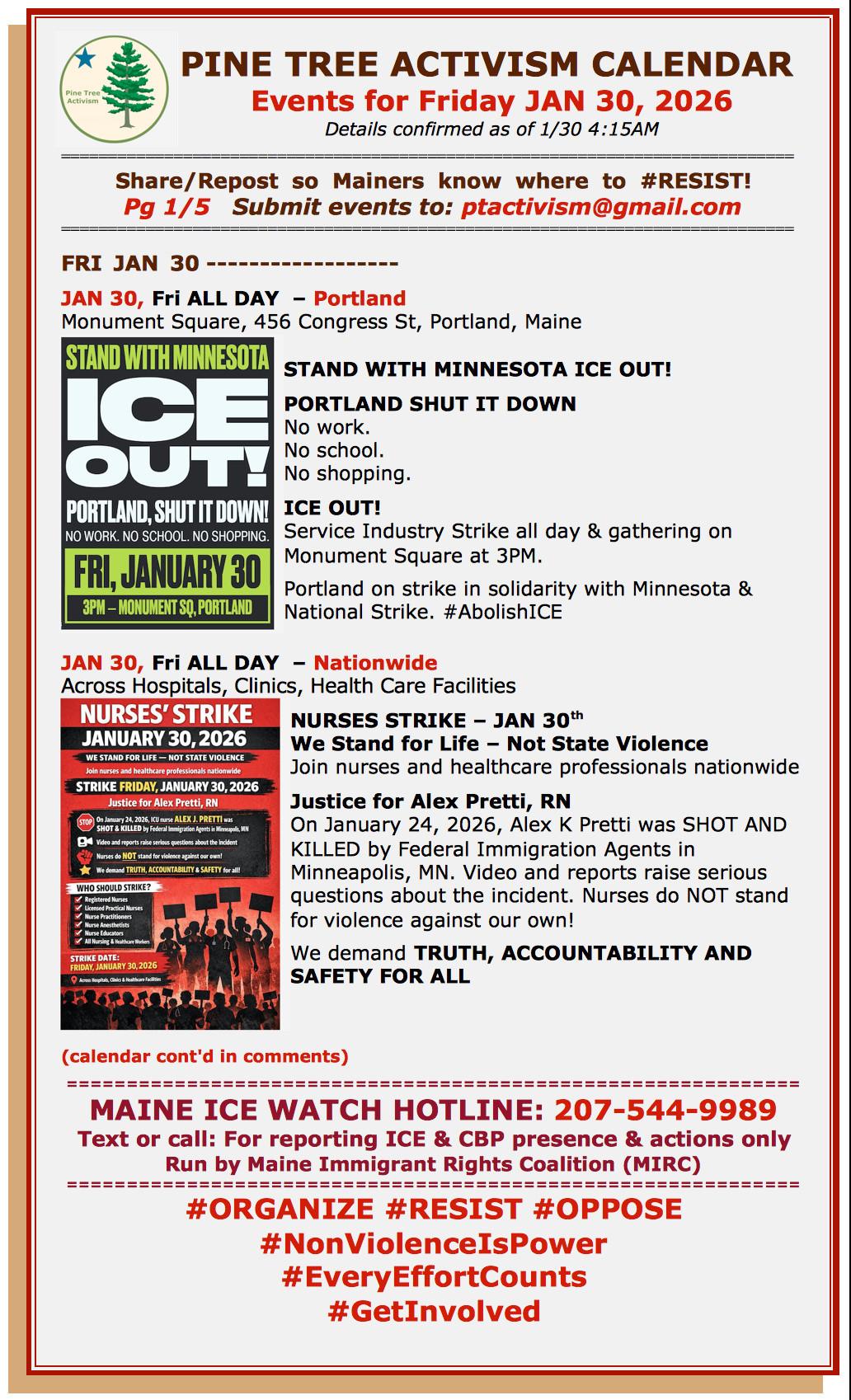 FRI JAN 30 JAN 30, Fri ALL DAY – Portland ME Monument Square, 456 Congress St, Portland, Maine STAND WITH MINNESOTA ICE OUT! PORTLAND SHUT IT DOWN No work. No school. No shopping. ICE OUT! Service Industry Strike all day & gathering on Monument Square at 3PM. Portland on strike in solidarity with Minnesota & National Strike. Abolish ICE JAN 30, Fri ALL DAY – Nationwide Across Hospitals, Clinics, Health Care Facilities NURSES STRIKE – JAN 30th We Stand for Life – Not State Violence Join nurses and healthcare professionals nationwide Justice for Alex Pretti, RN On January 24, 2026, Alex K Pretti was SHOT AND KILLED by Federal Immigration Agents in Minneapolis, MN. Video and reports raise serious questions about the incident. Nurses do NOT stand for violence against our own! We demand TRUTH, ACCOUNTABILITY AND SAFETY FOR ALL MAINE ICE WATCH HOTLINE: 207-544-9989 Text or call: For reporting ICE & CBP presence & actions only Run by Maine Immigrant Rights Coalition (MIRC)
