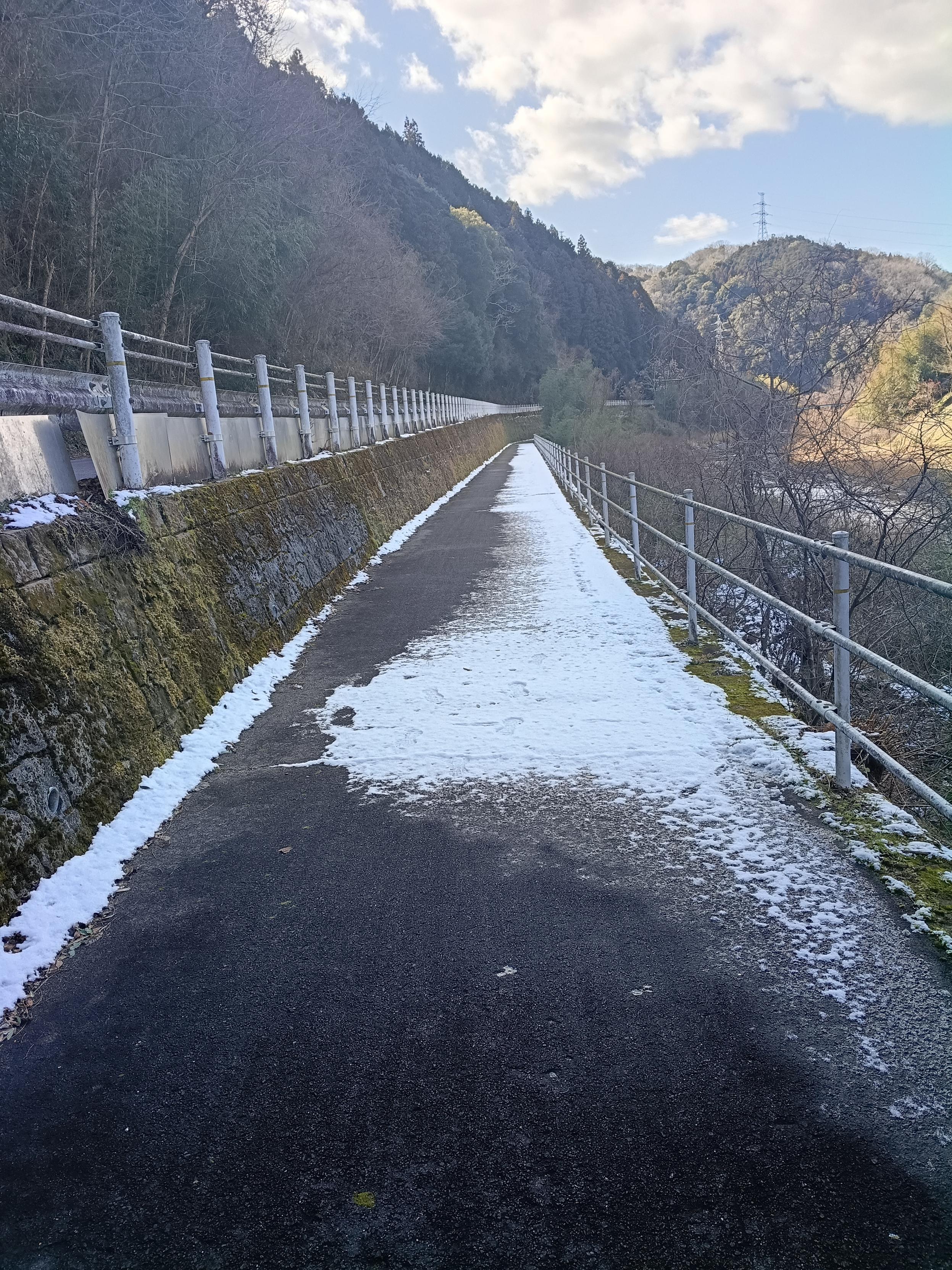 An icy paved pathway stretching into the distance, framed by forested mountains.