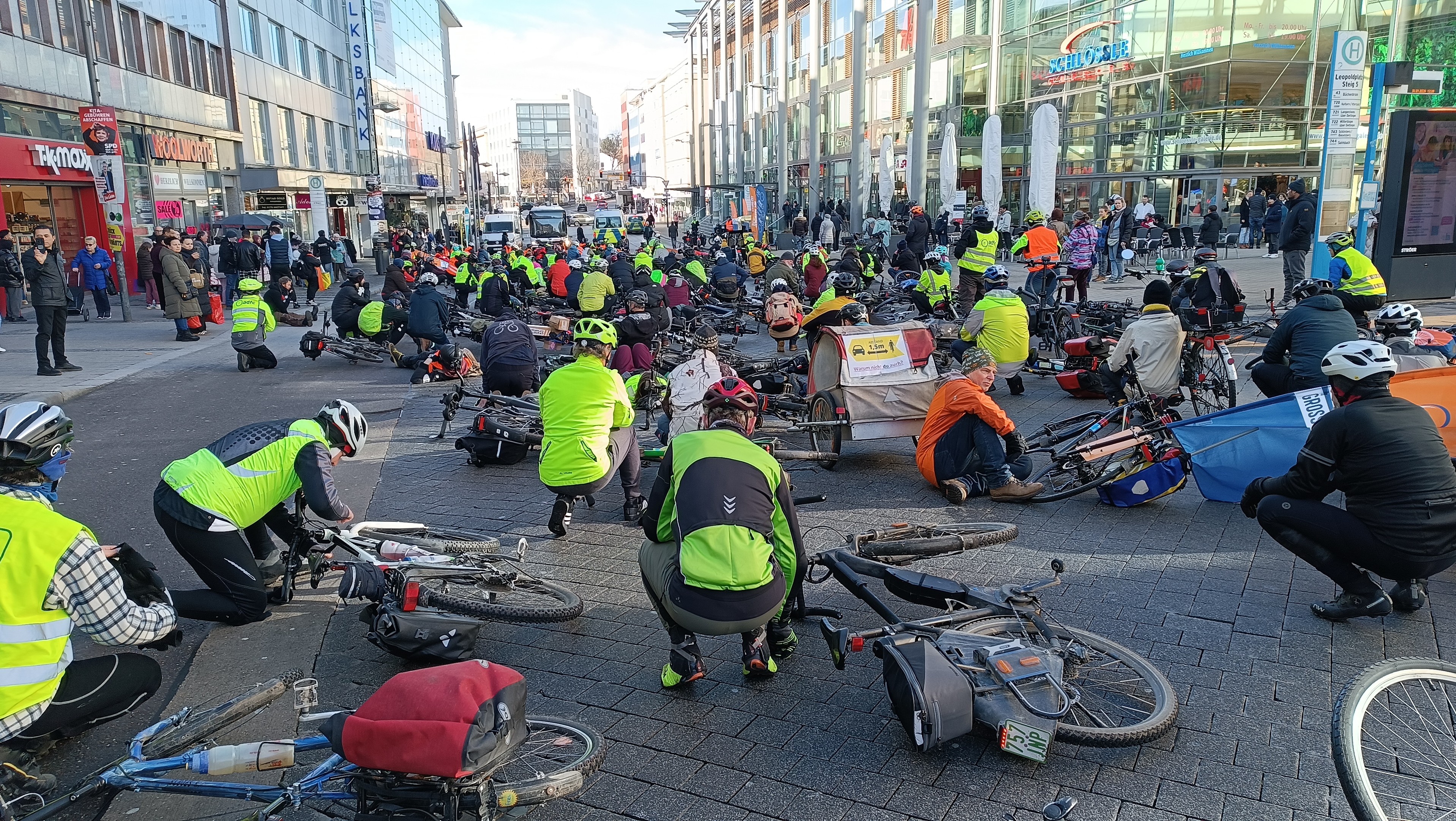 @ascentale @bikenite In the photo, we are staging a 'die-in' in the shopping district of the city of Pforzheim.