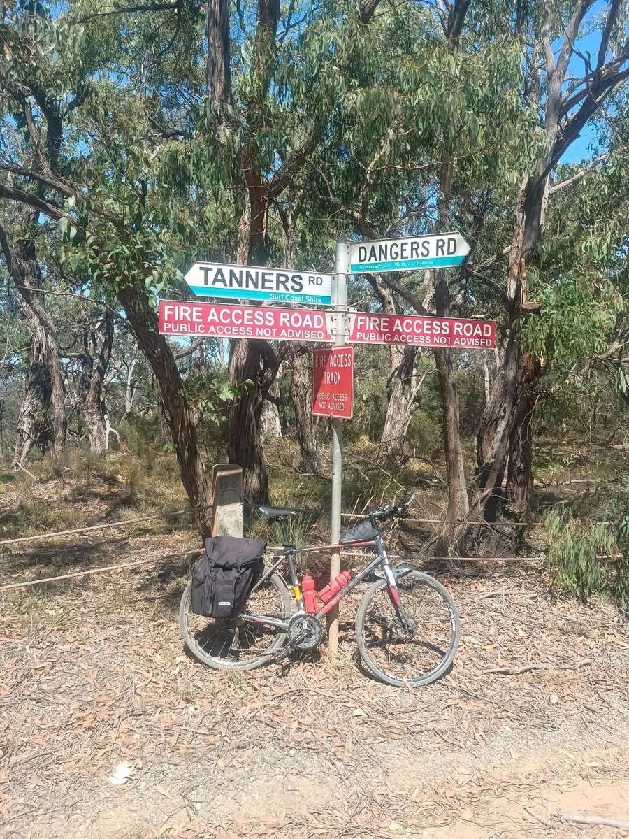 Bike on a gravel road leaning up against a road sign for "DANGERS RD" with another sign under it saying "FIRE ACCESS ROAD: PUBLIC ACCESS NOT ADVISED".