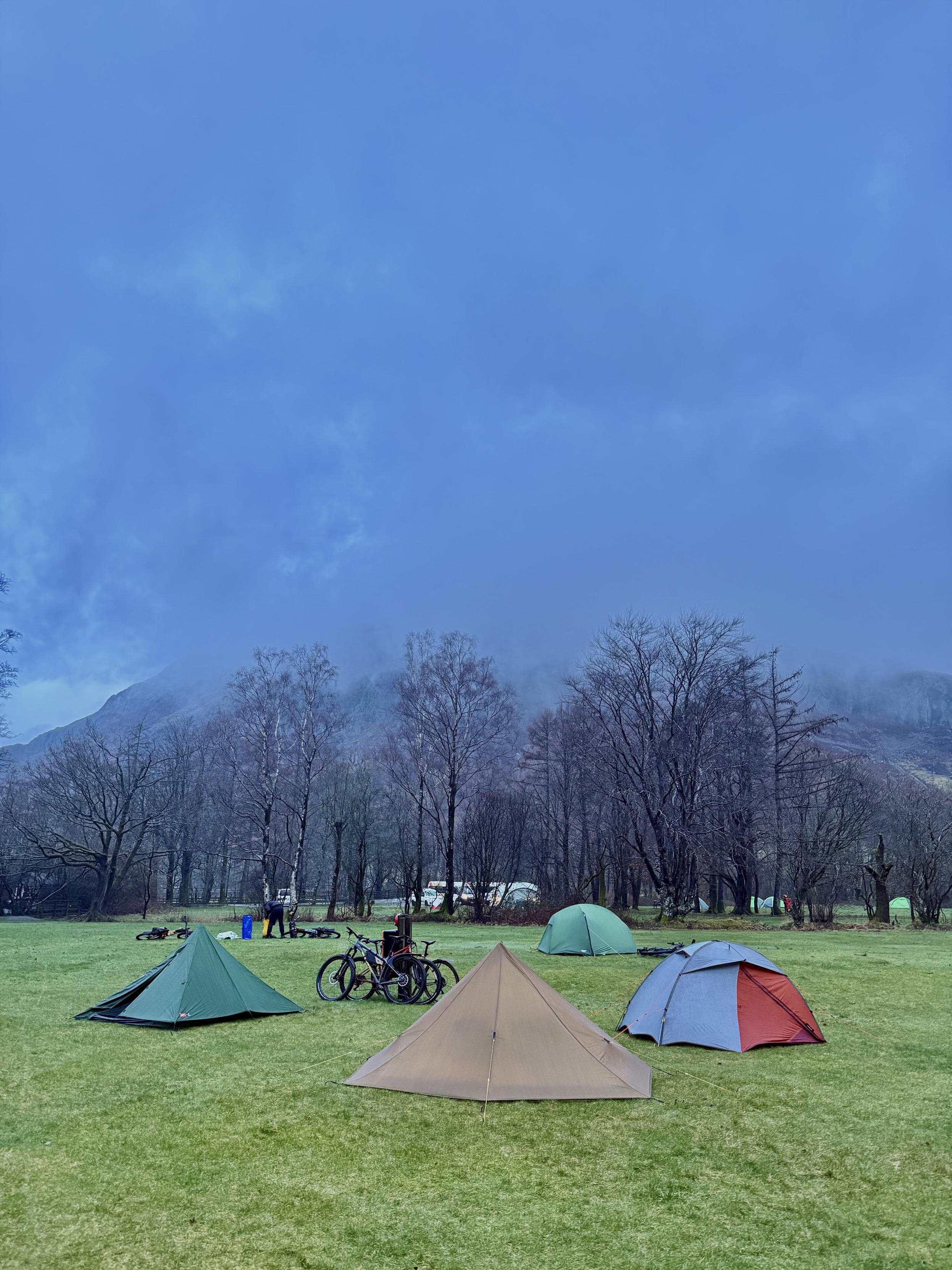 Tents surrounding a post with bikes stood against it, infront of trees and a cloud-topped fell.