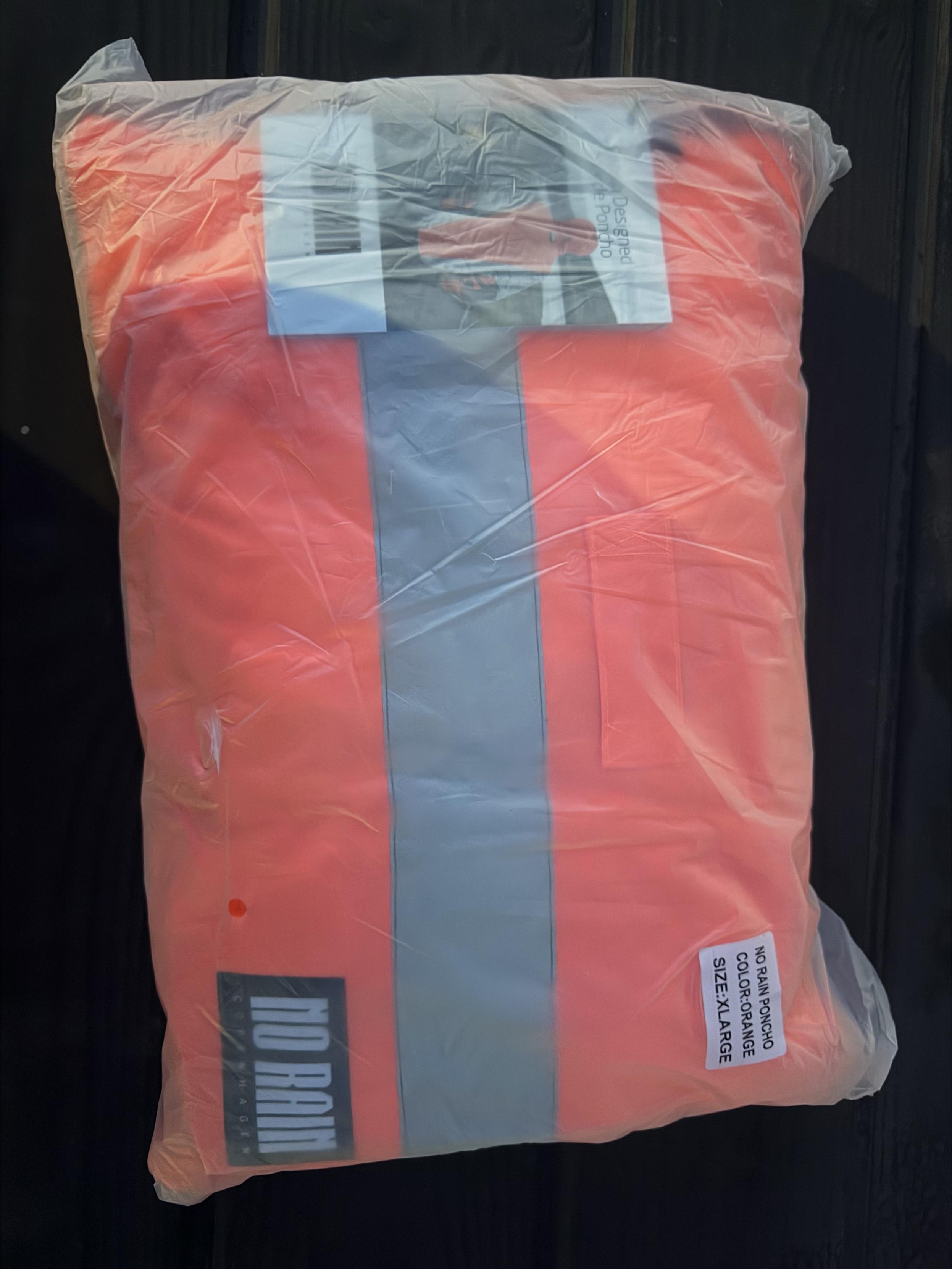 A packaged orange poncho, labeled as size extra large, with reflective gray stripes. The packaging features branding and care instructions.