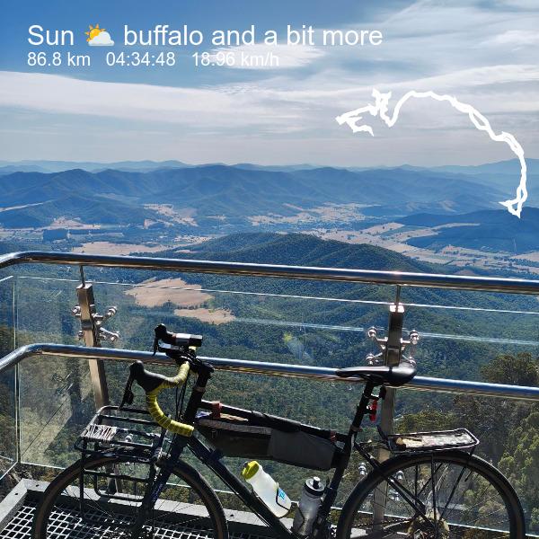 Last Sunday I rode up Mt Buffalo with four other - faster - riders, took the photo at The Chalet lookout, had a coffee, rode back down (wheeee!), a beer at Porepunkah, back to Bright, a salad roll, then by myself out to Wandiligong and back to stretch out my legs