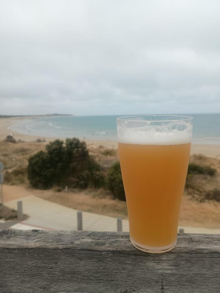 A  cold, foamy glass of beer standing on a railing overlooking a beautiful coastline and beach.  The day is bright but overcast, the beer is a hazy IPA, everything is blurry and washed out and 110-film-esque but that's mostly because the phone camera lens is filthy.