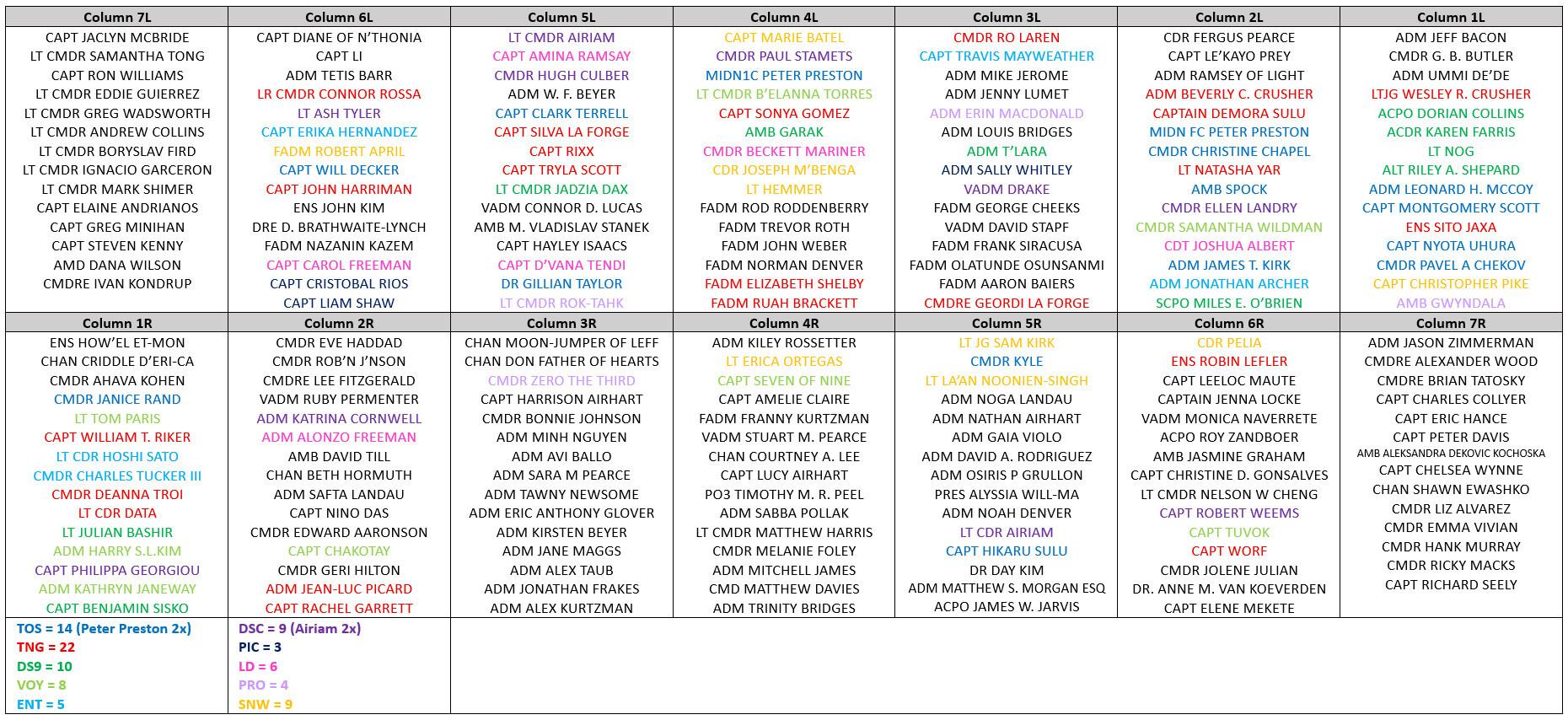 From #StarTrekVOY, we have the complete Starfleet main cast members (minus the Doctor) plus Seven of Nine (only listed here and not at #PIC) and Samantha Wildman. From #StarTrekENT, we have the Starfleet characters Archer, Tucker, Sato, Mayweather (no Malcolm Reed) and Captain Erika Hernandez. 4/8