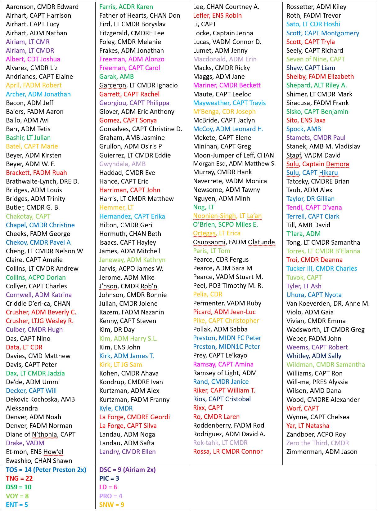 Here are all of the names, colour-coded by #StarTrek TV show. The first pic shows how the names are arranged on the commemoration wall in #StarfleetAcademy, the second pic lists al the names alphabetically and the third pic lists them by #StarTrek show. Compiling this took more than 4 hours...🖖