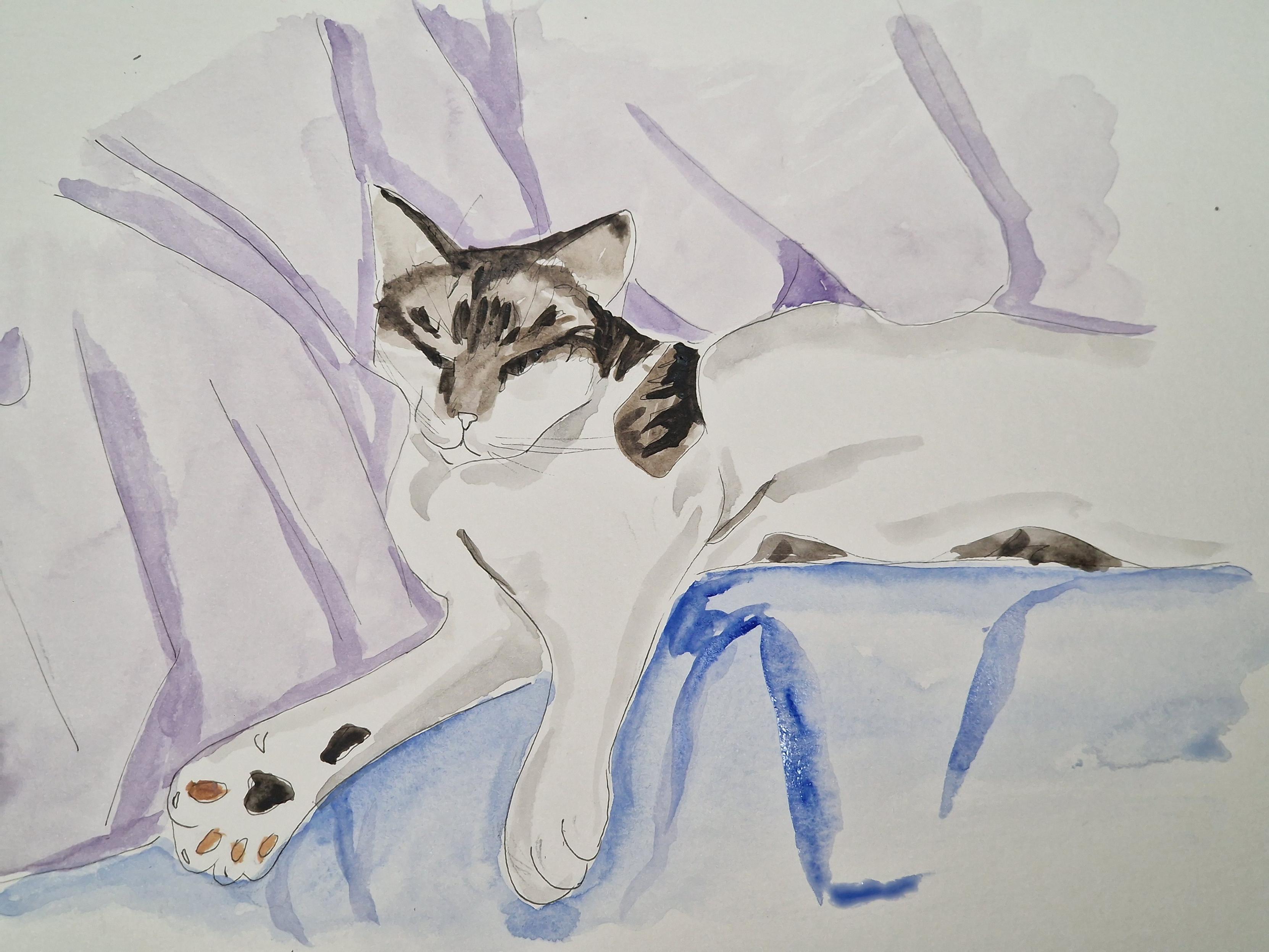 Watercolour sketch of a grey tabby and white cat, squished up into cushions and blankets