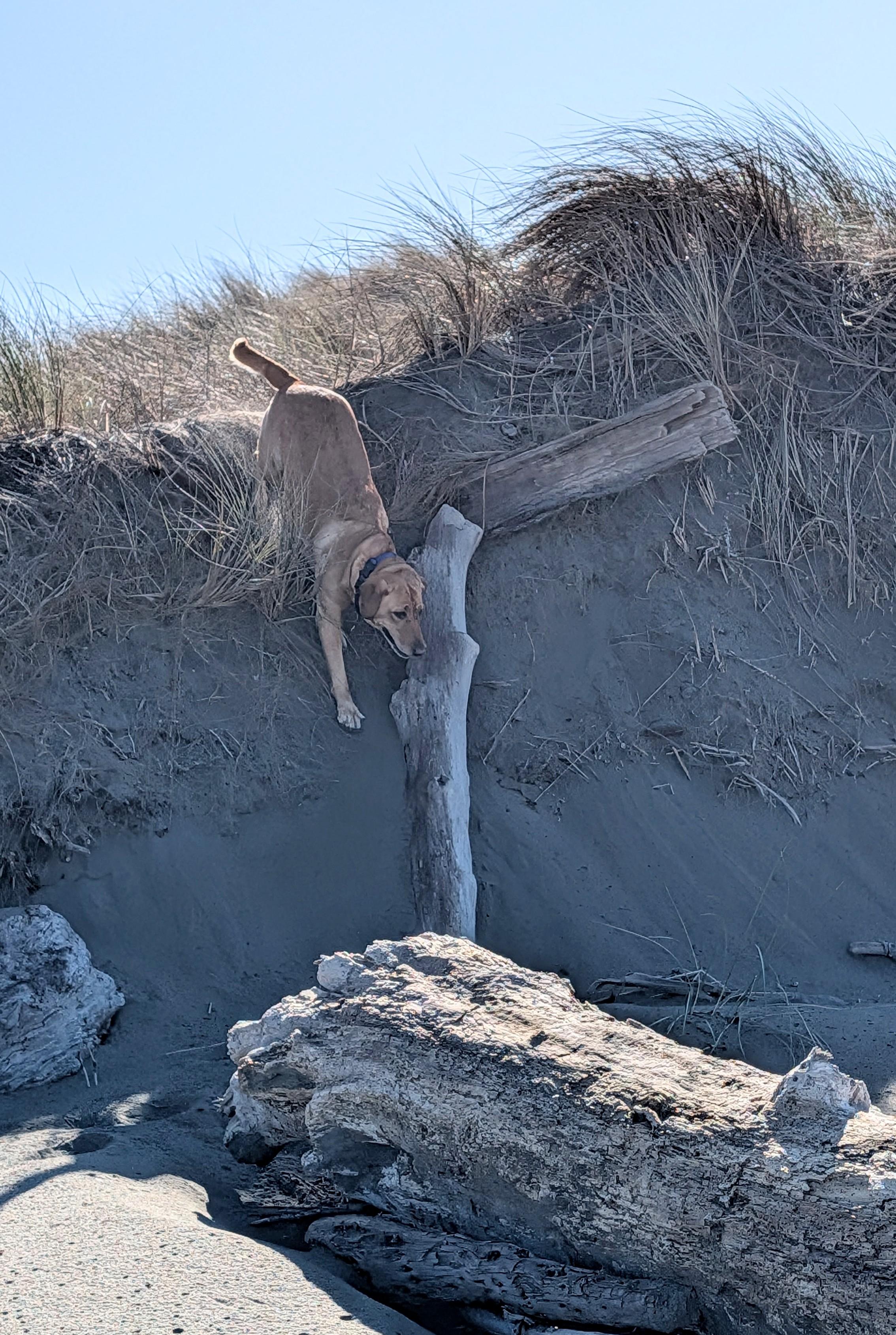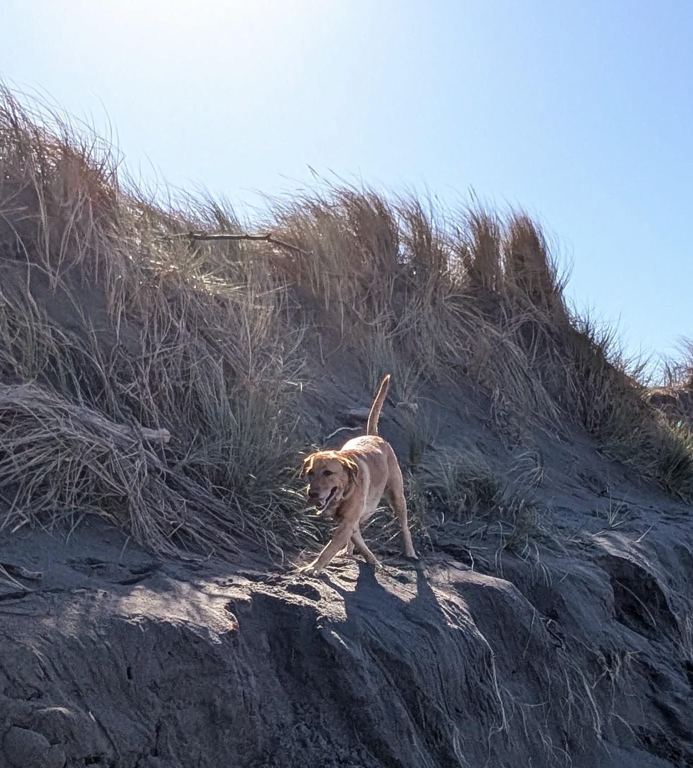 Golden lab running down a steep sandy drop off with driftwood.