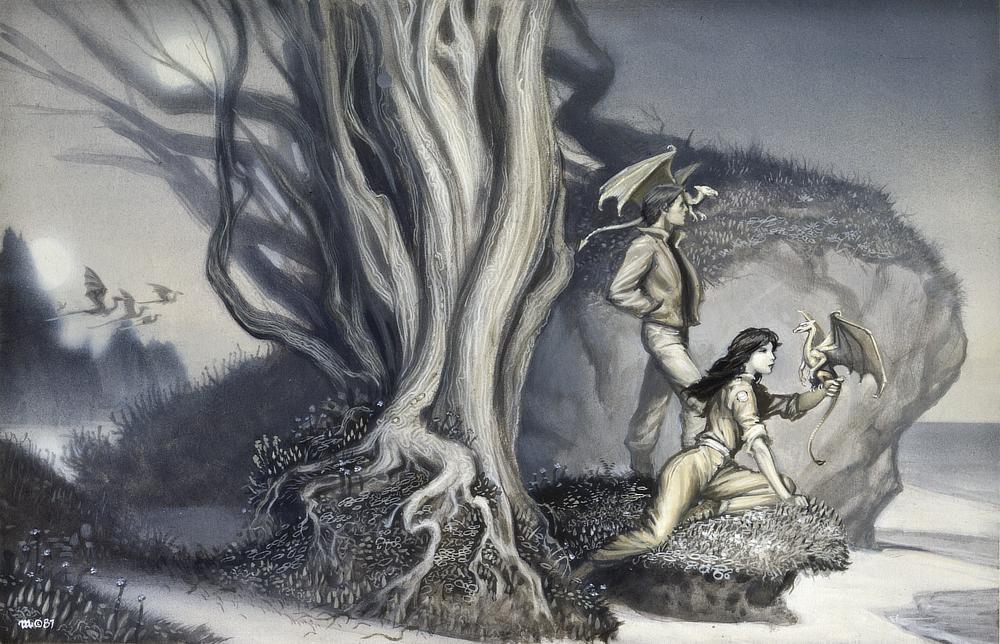 This was the first cover in the Dragonriders of Pern series to feature the beloved fire lizards and Michael really enjoyed painting them. He finished the painting, but he had a vague sense of uneas…