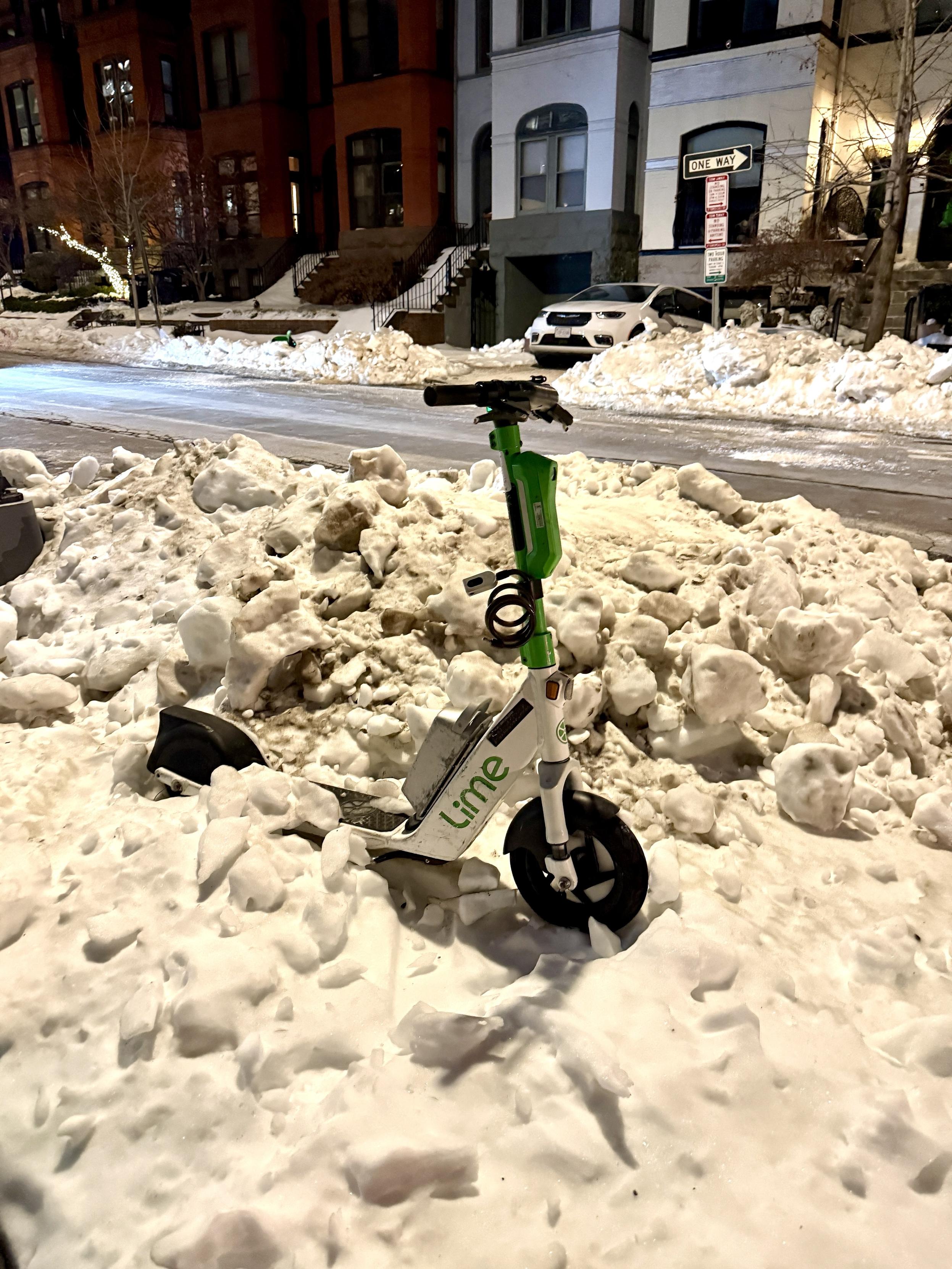 An electric scooter parked partially buried in snow on a DC city street at night, with a snow-covered sidewalk and buildings illuminated in the background.
