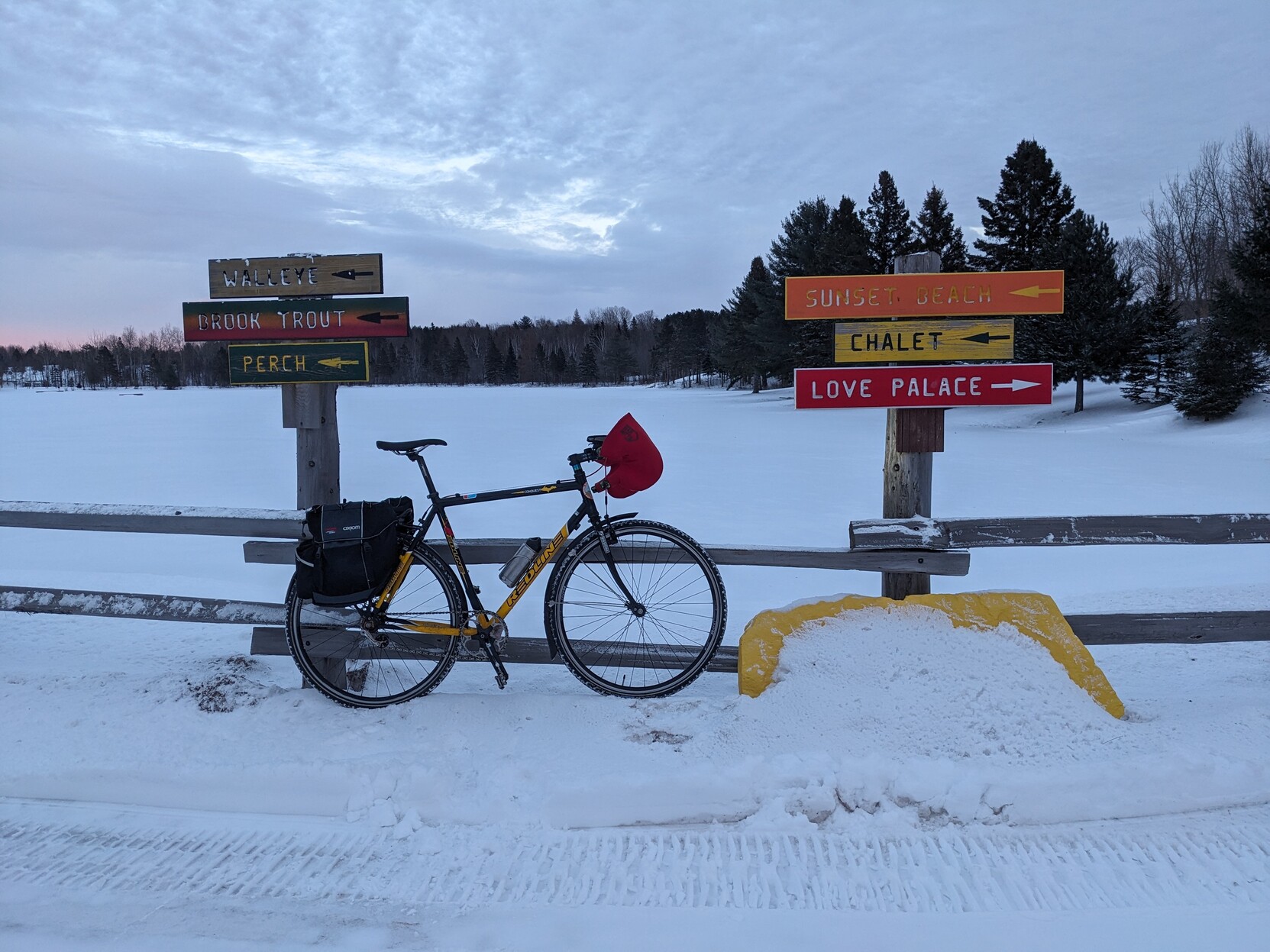 Redline Conquest cyclocross bike set up as single speed, parked on a fence by a snowy frozen pond. Friend "Cool Rock" (large rock painted yellow with sunglasses) is obscured by a snow drift.