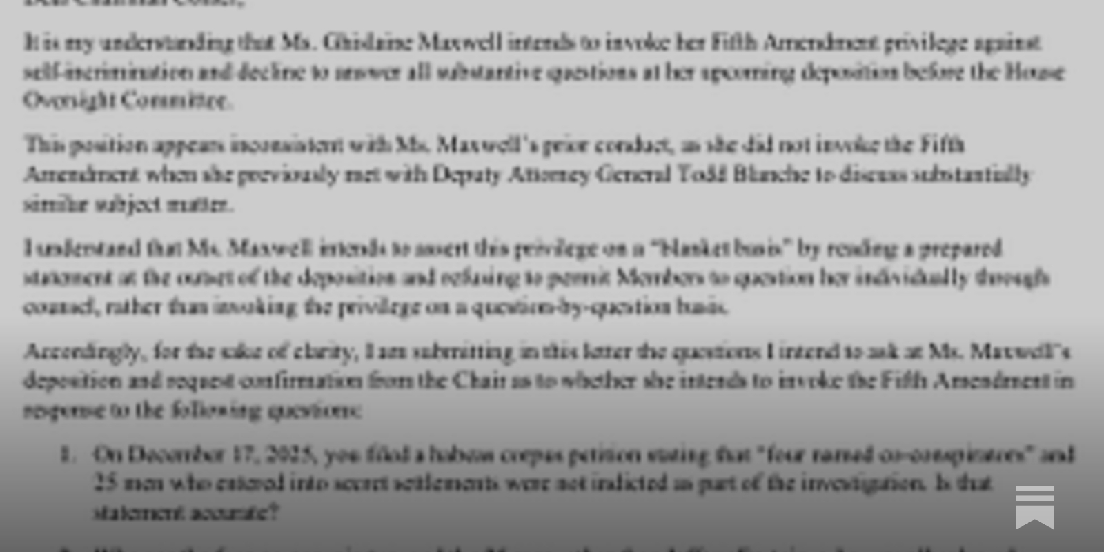 "In advance of Maxwell’s stonewalling, Khanna has now submitted, in advance, the exact questions he intends to ask Maxwell and asks Comer to confirm whether she will invoke the Fifth in response to each one.