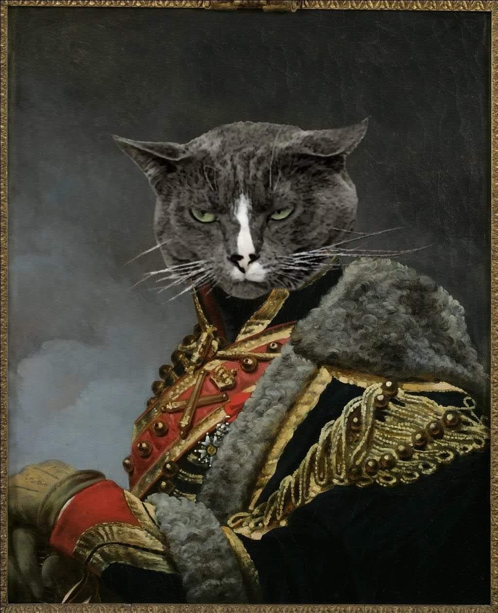 Victorian style painted portrait of what looks to be some military or noble person but the head has been replaced with the head of my grey cat Atticus.