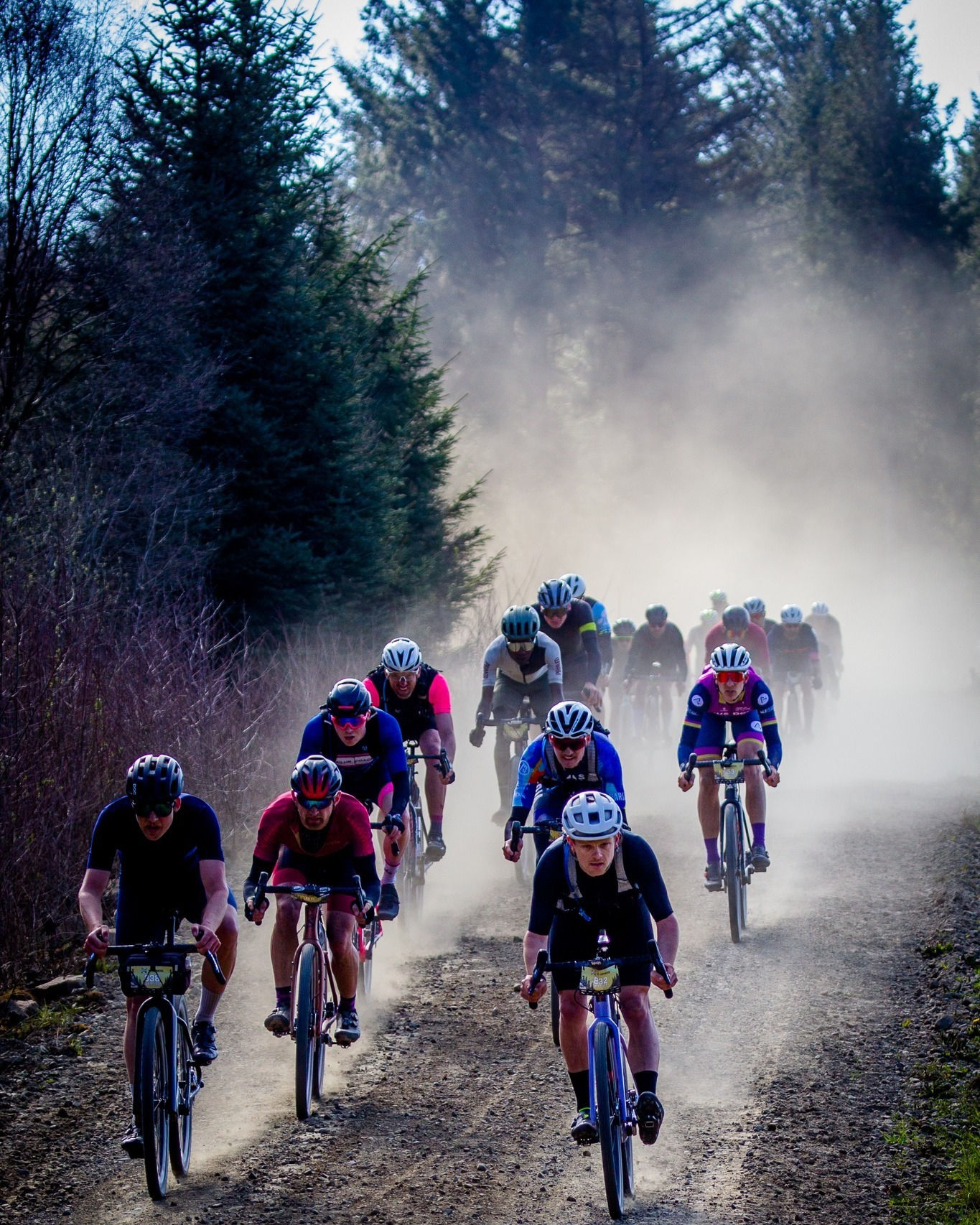 A bunch of cyclists riding along a dusty track through a pine forest. It is sunny and dry, they are creating a big cloud of dust.