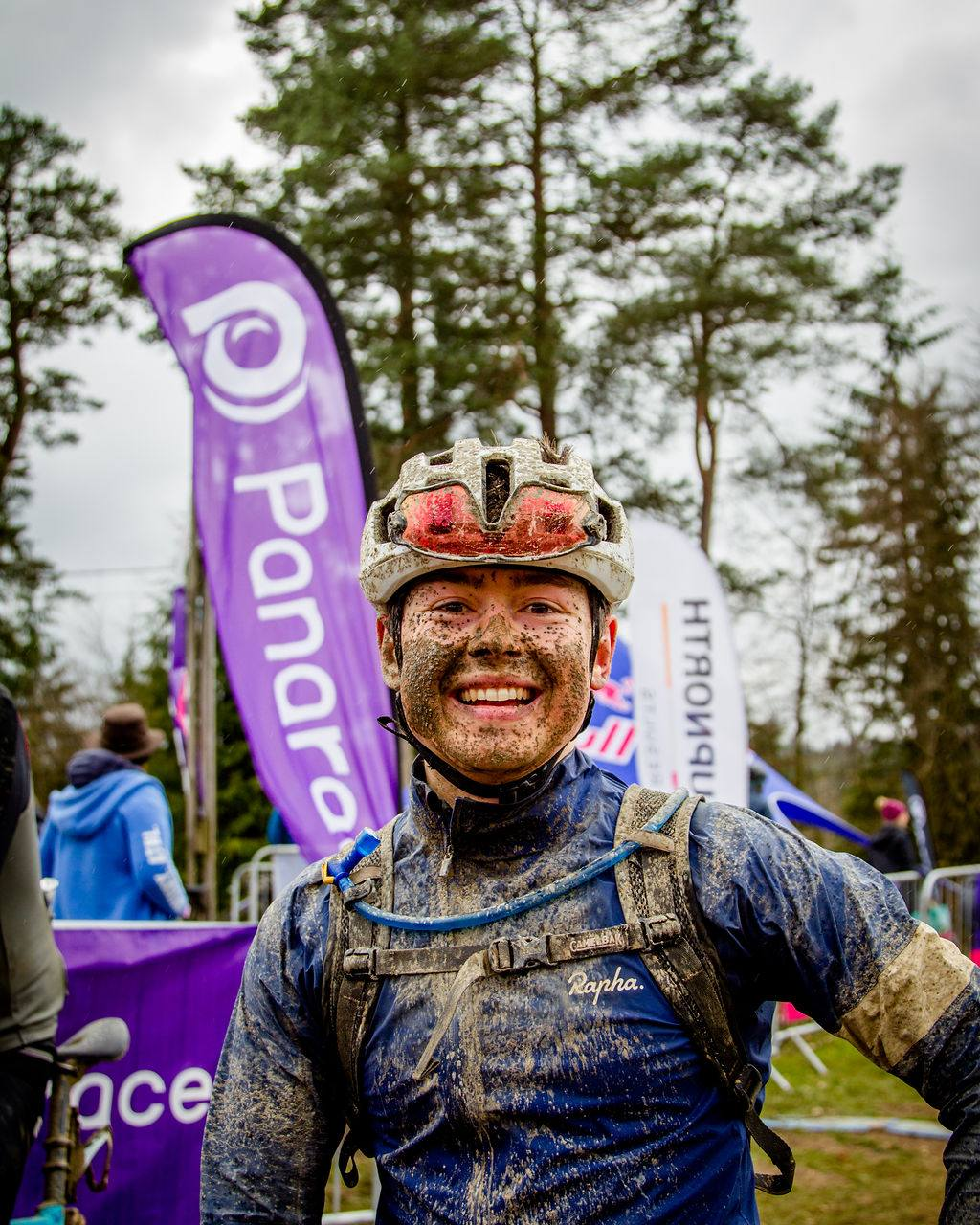 A grinning female cyclist, pictured post-event. She is liberally splattered in mud, with obvious clean patches where her glasses were.