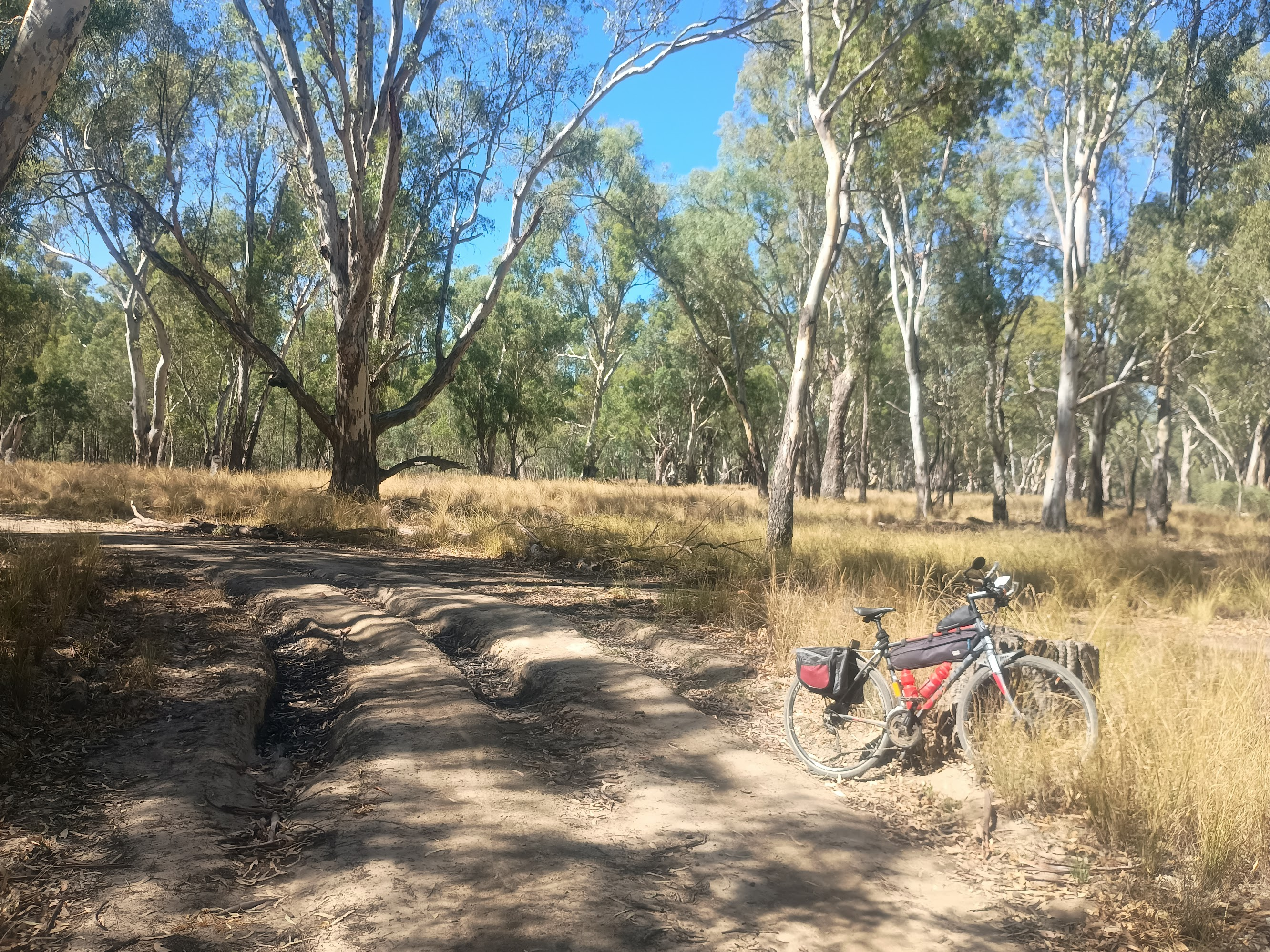 Bicycle on a dirt (not gravel!) road, leaning up against a stump. The road is mostly hard baked dirt but there's two very deep tyre tracks carved into it from a damper season.