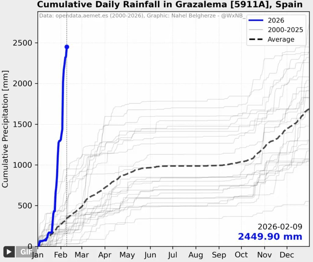 Rainfall graph showing a years worth of rainfall falling in ~48h