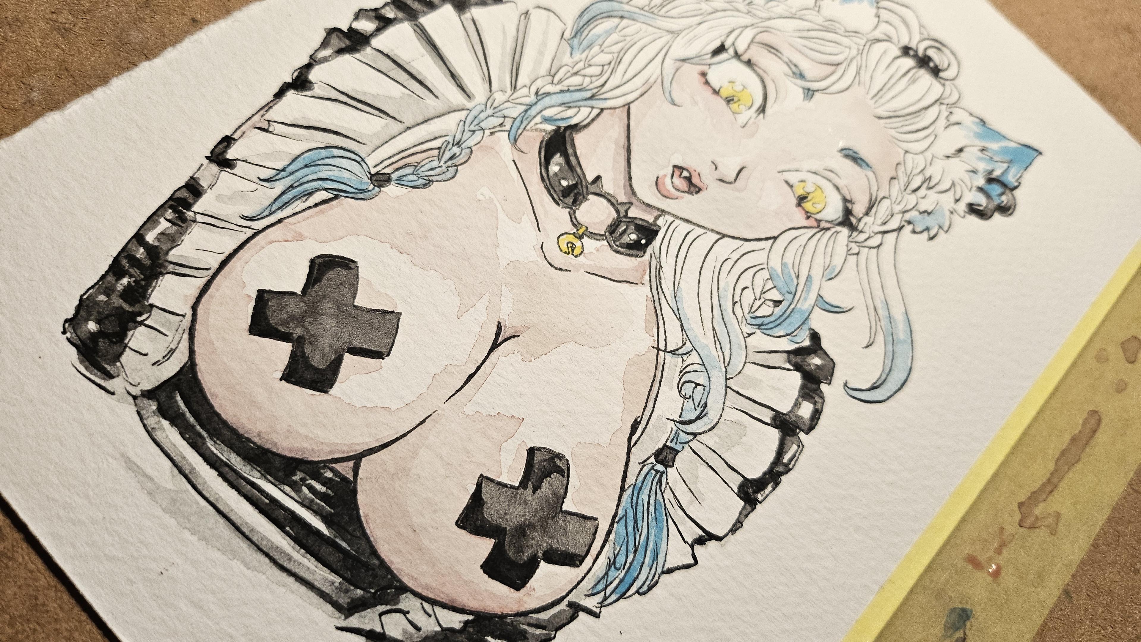 A tiddy catgirl being painted in watercolour - beginning stages with only the first layer of skin tone currently on
